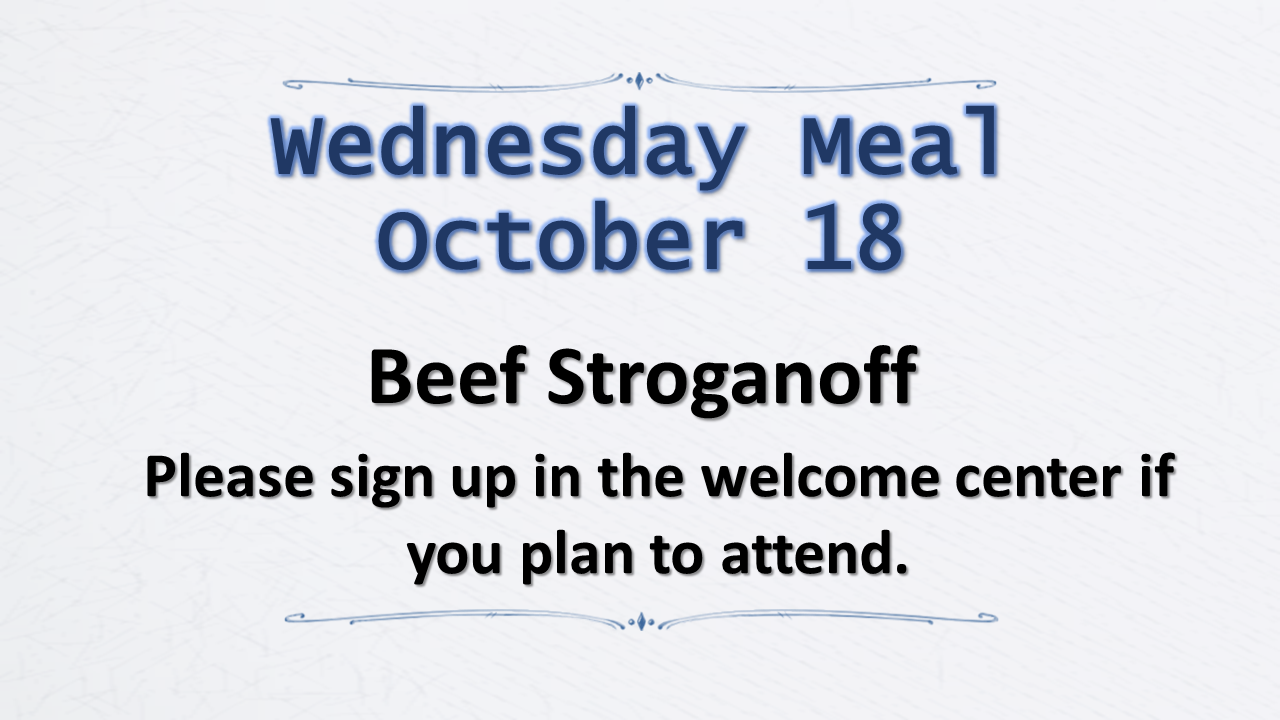 Sign up in the welcome center or contact us if you’d like to join us for dinner in the fellowship hall! $3.50 per adult, $1.50 per child 12 years and under, or $10.00 per family. Salad Only - adults and children - $1.50. Dessert Only - adults and children - $1.00 College students eat free!