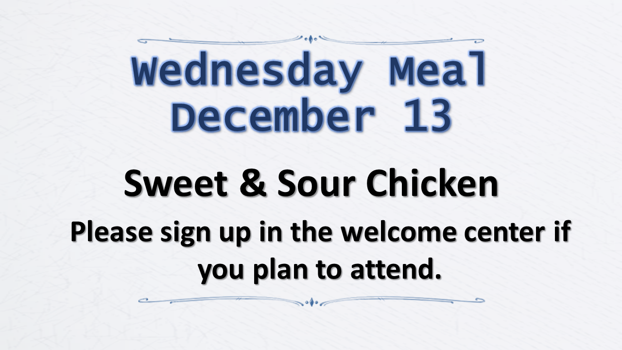 Sign up in the welcome center or contact us if you’d like to join us for dinner in the fellowship hall! $3.50 per adult, $1.50 per child 12 years and under, or $10.00 per family. Salad Only - adults and children - $1.50. Dessert Only - adults and children - $1.00 College students eat free!