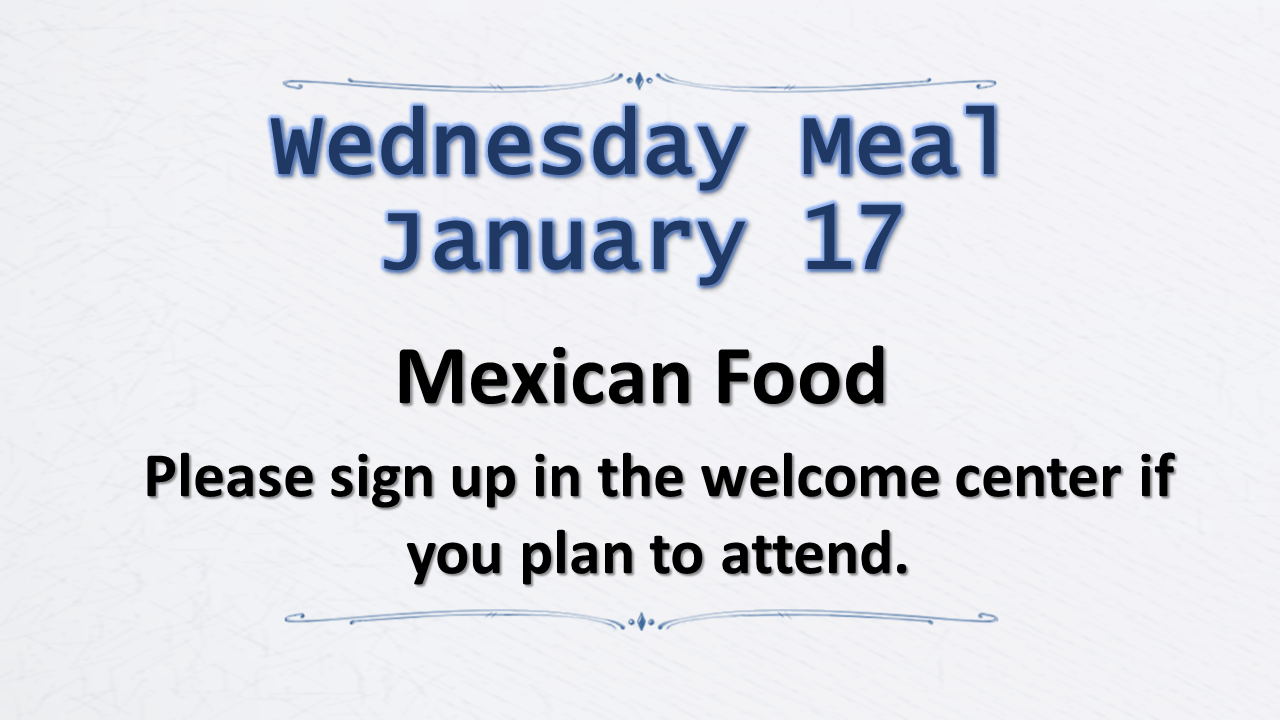 Sign up in the welcome center or contact us if you’d like to join us for dinner in the fellowship hall! $3.50 per adult, $1.50 per child 12 years and under, or $10.00 per family. Salad Only - adults and children - $1.50. Dessert Only - adults and children - $1.00 College students eat free!