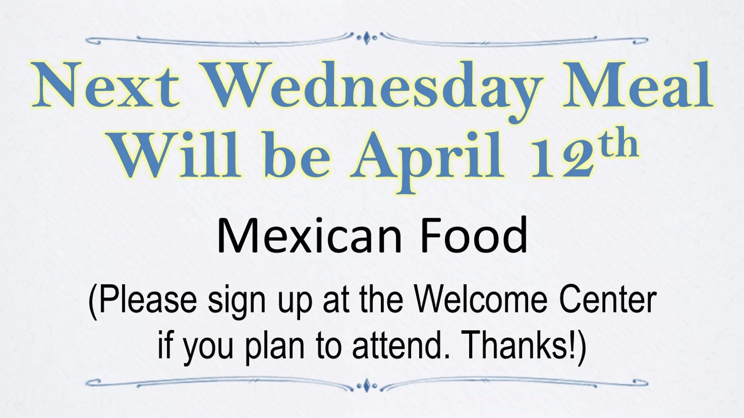Sign up in the welcome center or contact us if you’d like to join us for dinner in the fellowship hall! $4.00 per adult, $2.00 per child, or $10.00 per family. College students eat free!
