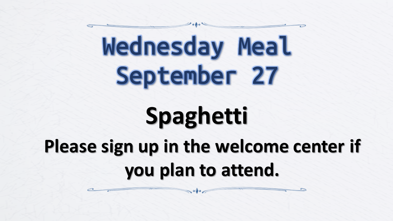 Sign up in the welcome center or contact us if you’d like to join us for dinner in the fellowship hall! $3.50 per adult, $1.50 per child 12 years and under, or $10.00 per family. Salad Only - adults and children - $1.50. Dessert Only - adults and children - $1.00 College students eat free!