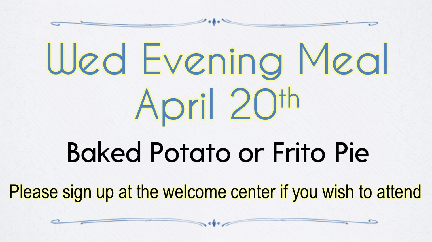Sign up in the welcome center or contact us if you’d like to join us for dinner in the fellowship hall! $3.50 per adult, $1.50 per child, or $10.00 per family. College students eat free!