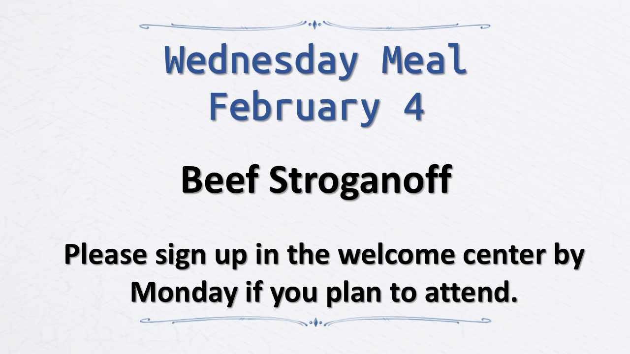 Sign up in the welcome center or contact us if you’d like to join us for dinner in the fellowship hall. $4.00 per adult, $2.00 per child 12 years and under, or $10.00 per family. College students and first time visitors eat free!