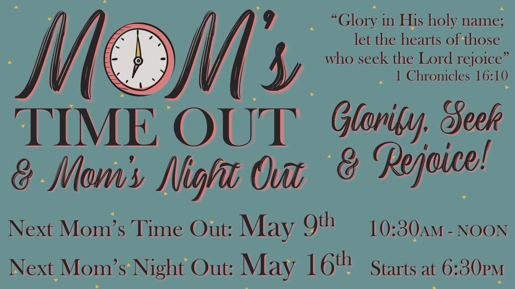 Mom's Time Out Monday, May 9, 2022 10:30 AM 12:00 PM 10:30 12:00 Google Calendar ICS Email us, or call us at 325.692.3206 for more information.
